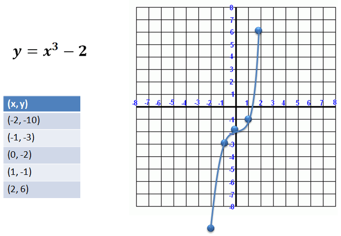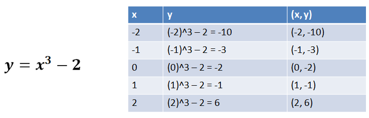 On the left, we have a cubic equation. We can graph it by plugging in a series of "x" values to determine the resulting "y" values. The table on the right shows how we calculated our ordered pairs for graphing.