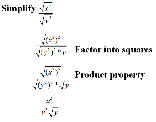A radical expression has been simplified when it meets the following conditions: -The index (n) is as small as possible. -The radicand contains no factors (except ‘1’) that are nth powers of an integer or polynomial. -The radicand contains no fractions. -No radicals appear in any denominator. |