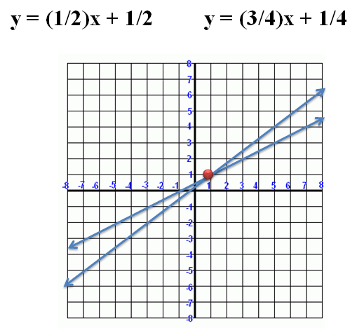 Above, we've written the two equations in slope-intercept form. We then graphed them, and found their intersection to be at (1, 1). Therefore, our solution is x = 1, and y = 1.