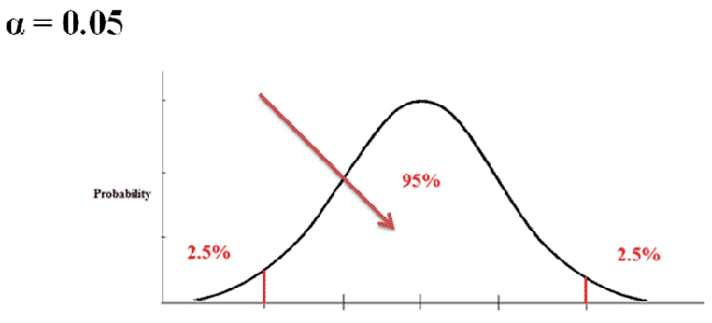 If the statistic we calculate is outside of that range, we will conclude that what we’re testing is not where we expect it to be, so it’s very likely that the null hypothesis is not true. So, we reject the null hypothesis and say that the alternative hypothesis is true.